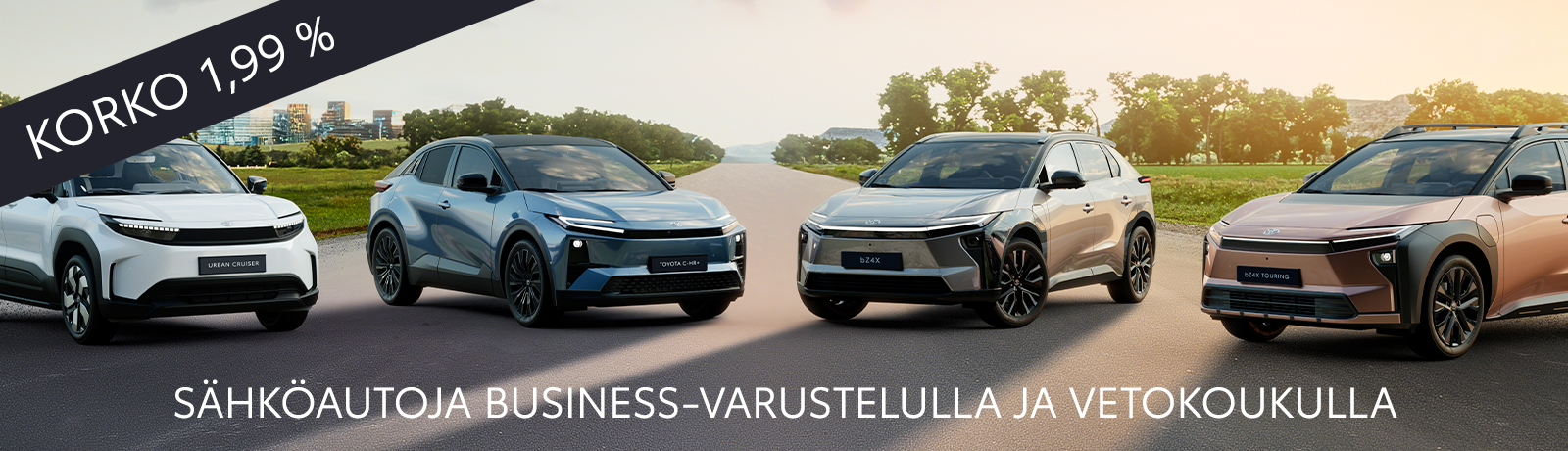 Toyota bZ4X C-HR+ Active Business 77 kWh AWD 49499,20 € sis. talvirenkaat, vetokoukku ja toimituskulut. Käsiraha 0 €, osamaksulla 49499,20 €, kk-erä 614,07 €/kk sis. käsittely 15 €/kk, luoton avaus 399 €, luottoaika 60 kk, viimeinen suurempi erä/taattu hyvityshinta 17967,80 €, luotto+luottokustannukset yht. 54197,64 €, todellinen vuosikorko 2,79 %.